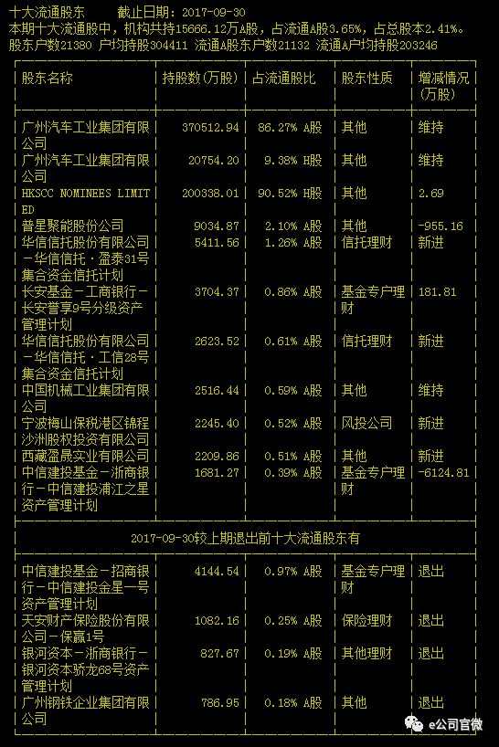 市場(chǎng)人士指出,信托資金或稱廣汽閃崩的禍?zhǔn)住YY料顯示,截至2017年9月30日,廣州汽車工業(yè)集團(tuán)有限公司為廣汽集團(tuán)第一大流通股股東,占流通股比例為60.12%。此外,華信信托有兩個(gè)產(chǎn)品進(jìn)入公司前十大流動(dòng)股東之列,均為去年三季度新進(jìn)。