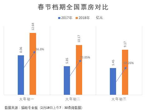 貓眼實時票房數據最新統(tǒng)計顯示,2月18日(大年初三)全國票房總收入為9.17億元,今年春節(jié)檔期前三天實現票房總收入為31.98億元,同比增長65.19%。2017年春節(jié)檔期總票房收入為33億元,按照目前增速,今年超過去年同期票房已經是板上釘釘。