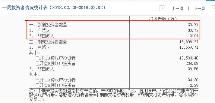 上周(20180226-20180302)中國證券市場(A、B股)新增投資者數(shù)量30多萬,其中自然人新增30.72萬戶,依然是絕對(duì)主力,非自然人新增0.04萬。截至上周末,中國資本市場投資者數(shù)量13,606.27萬,其中自然人13,569.71萬,非自然人36.56萬。