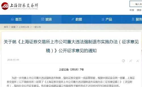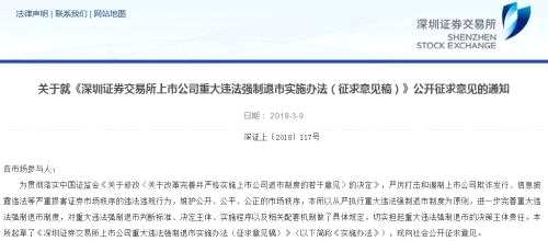 3月2日,證監(jiān)會(huì)發(fā)布的修改《關(guān)于改革完善并嚴(yán)格實(shí)施上市公司退市制度的若干意見(jiàn)》公開(kāi)征求意見(jiàn)中,明確要求強(qiáng)化交易所退市主體責(zé)任,制定重大違法退市實(shí)施規(guī)則。