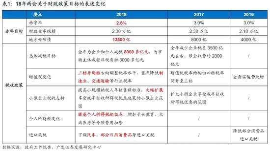 1、18年兩會政府工作報告對“減稅”的著墨顯著增加,減稅減費秉承“降成本”的政策思路,并有意向“高質(zhì)量”傾斜,將繼續(xù)為“供給端”注入活力。18年政府工作報告中對于減稅表述的亮點有以下幾個方面:(1)減稅減費的重要性上升。18年“大力簡政減稅減費”被寫入18年工作部署的第一段,體現(xiàn)出今年的供給側(cè)改革思路將從“三去”逐步進入“一降一補”發(fā)力階段。(2)總體減稅目標上升,涉及企業(yè)稅、個人稅、進口關(guān)稅等稅種。18年政府工作報告設(shè)立“全年為企業(yè)和個人減稅8000億元”的目標,并“下調(diào)汽車、部分日用消費品等進口關(guān)稅”,相比17年“減少企業(yè)稅負3500億元”的表述,涉及的稅種和優(yōu)惠的力度均有所擴大。(3)增值稅率將 “三檔并兩檔”。預(yù)計18年繼續(xù)下調(diào)增值稅稅率,并向制造業(yè)、交運等行業(yè)傾斜。(4)提高個人所得稅起征點。這也是自2011年以來時隔7年再次討論降低個稅。