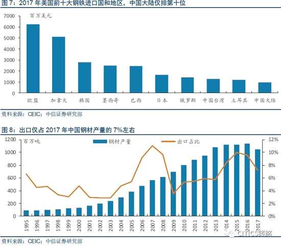 ?對鋼鐵行業(yè)實質(zhì)性影響有限。以2017年的數(shù)據(jù)來看,中國大陸并不是美國的主要鋼鐵進口方,中國大陸僅排第10位,歐盟和韓國才是此次關(guān)稅政策的主要利益受損方。且從國內(nèi)的情況來看,以鋼材為例,2017年中國鋼材出口僅占總產(chǎn)量的7.19%,且出口至美國的鋼材量僅占出口總量的1.57%,占比極低。