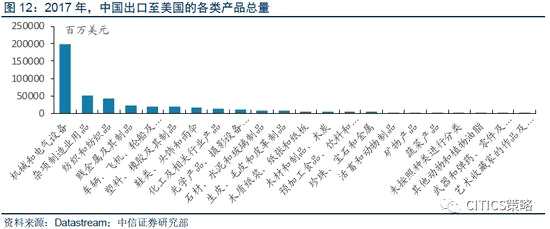 按照出口品類劃分,中國出口至美國排名前五的行業(yè)分別為:機械和電氣設(shè)備、雜項制造業(yè)、紡織、賤金屬、車輛&飛機&輪船及運輸設(shè)備,分別占2017年出口至美國總額的45.8%、12.0%、9.8%、5.3%和4.5%,那么一旦美國對中國采取針對性關(guān)稅政策,預(yù)計首當(dāng)其沖的會是機械、紡織制品、塑料橡膠這些行業(yè)。