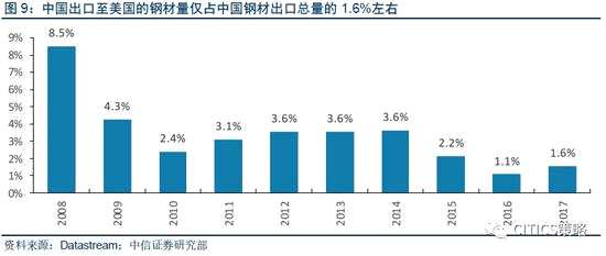 且從國內(nèi)的情況來看,以鋼材為例,2017年中國鋼材出口僅占總產(chǎn)量的7.19%,且出口至美國的鋼材量僅占出口總量的1.57%,占比極低。