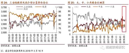基金持倉方面,股票型基金整體倉位(2018年3月16日)較前一期(2018年3月9日)提升0.77%至93.19%;混合型基金整體倉位較前一期增加0.69%至84.63%。大盤股倉位較前一期提升1.78%至37.9%;中盤股倉位較前一期下降1.67%至21.95%,小盤股倉位較前一期提升0.6%至22.6%。