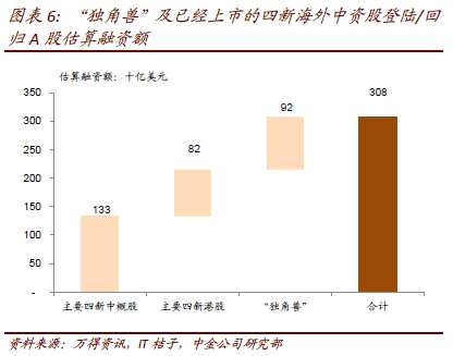 “獨(dú)角獸”及已經(jīng)上市的四新海外中資股登陸、回歸A股估值融資額。數(shù)據(jù)來(lái)源:中金公司研究部。