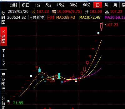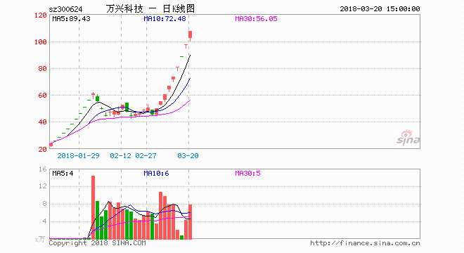 3月20日,萬興科技再度漲停,股價報收107.23元。在此之前,萬興科技已經(jīng)連續(xù)走出了8個漲停板。