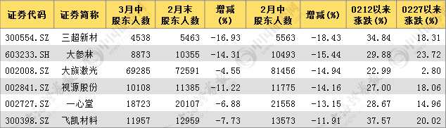 如果進(jìn)一步觀察大盤自2月中旬探底回升以來的個(gè)股籌碼變化情況,在可比的260只個(gè)股中,130只個(gè)股3月中旬的股東人數(shù)較2月中旬有所下降。其中,8只個(gè)股(見下表)股東人數(shù)下降幅度超過了10%,三超新材(300554)以-18.43%的降幅居首。同樣的,這些個(gè)股2月12日以來平均漲幅高達(dá)26.88%,與股東人數(shù)下降呈明顯的正反饋態(tài)勢(shì)。