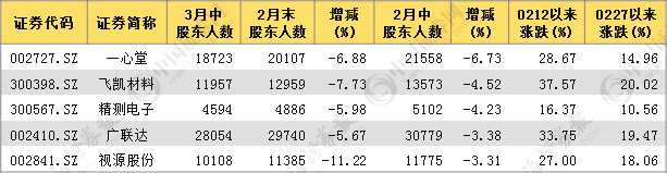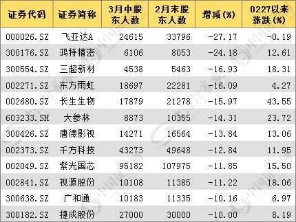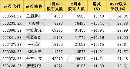 結(jié)合3月中旬、2月末以及2月中旬的股東人數(shù)一起觀察,在可比的250只個(gè)股中,有62只個(gè)股3月中旬股東人數(shù)較2月末、2月末股東人數(shù)較2月中旬呈遞減態(tài)勢(shì),其中有6只個(gè)股(見下表)近一個(gè)月以來股東人數(shù)減少了逾10%。