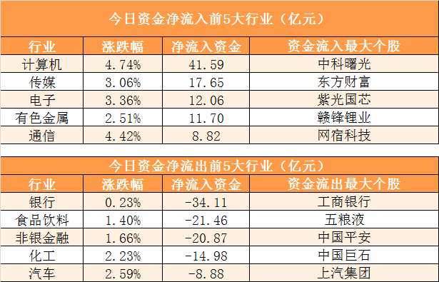 3計(jì)算機(jī)行業(yè)凈流入41.59億元居首