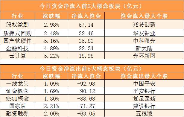 概念板塊方面,今日股權(quán)激勵、質(zhì)押式回購、國產(chǎn)軟硬件等概念資金呈現(xiàn)凈流入,其中股權(quán)激勵概念凈流入57.14億元居首。