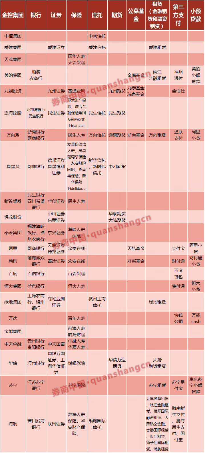 據(jù)券商中國(guó)記者不完全統(tǒng)計(jì),目前幾大金控陣營(yíng)包括:央企金控、地方金控、民營(yíng)金控、集團(tuán)金控、互聯(lián)網(wǎng)金控等。