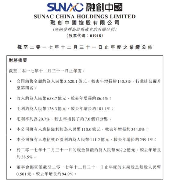 3月29日早間,融創(chuàng)中國(guó)2017年全年業(yè)績(jī)公告顯示,公司資產(chǎn)總額6231億元,合同銷售金額約為3620.1億元,較去年增長(zhǎng)約140.3%,行業(yè)排名躍升至第四名;收入約658.7億元,同比增長(zhǎng)約86.4%;毛利約136.3億元,同比增長(zhǎng)約181.1%;凈利110億元,同比增長(zhǎng)344%;現(xiàn)金余額約967.2億元,較2016年增長(zhǎng)約38.5%。公司總負(fù)債5624億元,融創(chuàng)借貸總額2192億元。