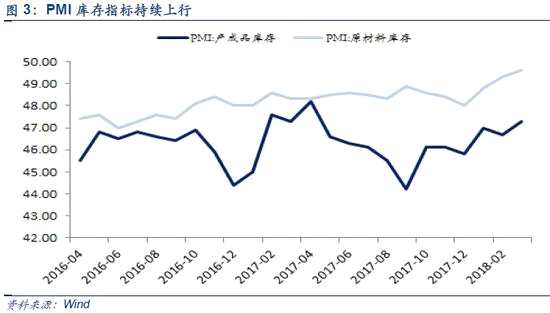 3月30日,國(guó)家統(tǒng)計(jì)局公布3月PMI為51.5,比上月上升1.2個(gè)百分點(diǎn),超越市場(chǎng)預(yù)期。值得注意的是,上升超預(yù)期主要來(lái)自中小型企業(yè)升幅超預(yù)期:大型企業(yè)PMI上升0.2,中型上升1.4,小型企業(yè)上升5.3,這驗(yàn)證了我們年度報(bào)告邏輯:中小型企業(yè)復(fù)蘇呈現(xiàn)滯后特性,但其彈性也將更大。我們認(rèn)為今年經(jīng)濟(jì)及大型企業(yè)的盈利復(fù)蘇預(yù)期差有限,短期經(jīng)濟(jì)反彈超預(yù)期可能與兩會(huì)后的政策落地及復(fù)工有關(guān),從中期持續(xù)性角度,2018年財(cái)政赤字率收縮與棚戶區(qū)改造增速下行,實(shí)體去杠桿推進(jìn),貿(mào)易摩擦上升,在社融增速與貿(mào)易盈余都大概率走向收縮的背景下,后續(xù)總需求格局大概率依然是穩(wěn)中趨緩。PMI分項(xiàng)指數(shù)中,產(chǎn)生品和原材料庫(kù)存均持續(xù)上升,呈現(xiàn)補(bǔ)庫(kù)存特征,但未來(lái)庫(kù)存壓力將制約周期品價(jià)格。