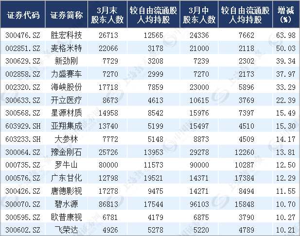統(tǒng)計(jì)顯示,141只個(gè)股3月末人均持股較3月中有所增加。其中,35只個(gè)股增超5%,16只個(gè)股增超10%(見下表),勝宏科技(300476)(63.98%)、麥格米特(002851)(50.03%)以逾50%的人均增持比例居前。顯然,這些個(gè)股在近半個(gè)月內(nèi)籌碼明顯趨向大幅集中,或有大資金利用市場(chǎng)震蕩不斷吸籌。
