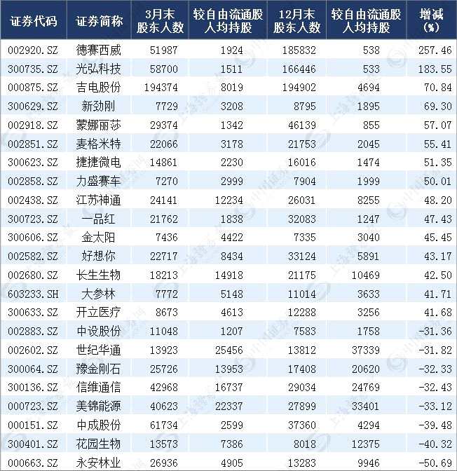 如果以3月末人均持股數(shù)跟去年12月末進(jìn)行比較,則42只個(gè)股增超20%,15只個(gè)股增超40%(見下表),德賽西威(002920)(257.46%)、光弘科技(300735)(183.55%)以逾100%的增持比例居前;29只個(gè)股人均持股減少幅度超過了10%,8只個(gè)股減超30%(見下表),永安林業(yè)(-50.69%)、花園生物(300401) (-40.32%)以逾40%的人均減持比例居前。