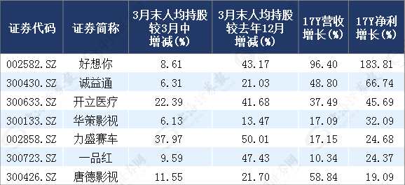 綜合來看,3月末人均持股較去年12月末增加10%以上、3月末人均持股較3月中增加5%以上、2017年?duì)I收和凈利增長(zhǎng)均超過10%的個(gè)股有7只(見下表)。這些個(gè)股一邊是業(yè)績(jī)高成長(zhǎng),一邊是籌碼連續(xù)趨向集中,或有大資金在持續(xù)布局。