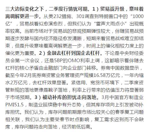國(guó)泰君安(601211)首席分析師李少君:目前市場(chǎng)在貿(mào)易摩擦、結(jié)構(gòu)性去杠桿以及新興經(jīng)濟(jì)三方環(huán)境的影響下,已經(jīng)趨于均衡。并且伴隨該三大因素預(yù)期演化,二季度行情可期。具體而言,貿(mào)易摩擦未來(lái)將大概率在中美溝通下達(dá)成一致;同時(shí)存量市格局下,新興經(jīng)濟(jì)/CDR+結(jié)構(gòu)性去杠桿的組合將引導(dǎo)市場(chǎng)走向均衡。