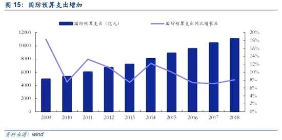 國防軍工(披露率為40.82%)18Q1單季度歸母凈利潤與17Q4相比由負(fù)轉(zhuǎn)正,歸母凈利潤同比增速由17Q4的-59.00%上升至18Q1的41.72%。2018年軍費(fèi)支出達(dá)11069.5億元,同比增長8.1%,軍費(fèi)支出是國防軍工凈利潤增長的主要動因。