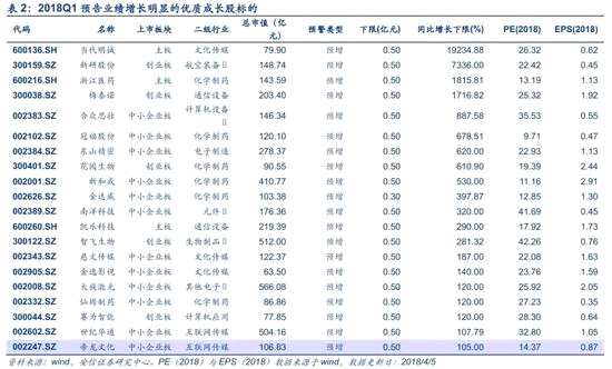 個股方面,我們從目前已經(jīng)披露一季度業(yè)績預(yù)告的上市公司中選取預(yù)告歸母凈利潤同比增速明顯的優(yōu)質(zhì)成長股標(biāo)的。具體篩選標(biāo)準(zhǔn):1、最新總市值不低于50億元;2、預(yù)告業(yè)績下限不低于2000萬元;3、預(yù)告業(yè)績同比增速下限不低于100%;4、連續(xù)4個季度ROE平均值不低于10%;5、2018年預(yù)測PE不超過50倍。