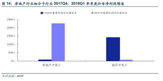 房地產(chǎn)(披露率為7.69%)18Q1單季度盈利加速增長,歸母凈利潤同比增速為1047.87%(17Q4:73.65%)。從房地產(chǎn)二級行業(yè)細(xì)分來看,房地產(chǎn)開發(fā)Ⅱ和園區(qū)開發(fā)Ⅱ18Q1同比增長率分別為2272.06%和77.48%,房地產(chǎn)開發(fā)Ⅱ是其主要的利潤增長來源。
