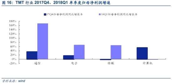 從已披露的一季報業(yè)績預(yù)告來看,18Q1單季度TMT行業(yè)分化明顯,傳媒同比增速由負(fù)轉(zhuǎn)正,通信、電子行業(yè)環(huán)比明顯改善,計算機(jī)增速回落。