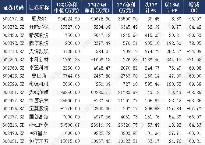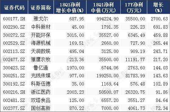 就具體個(gè)股來(lái)看,統(tǒng)計(jì)顯示,一季度預(yù)告凈利潤(rùn)中值大于去年全年利潤(rùn)的公司有30家(剔除2017年盈利為負(fù)公司)。