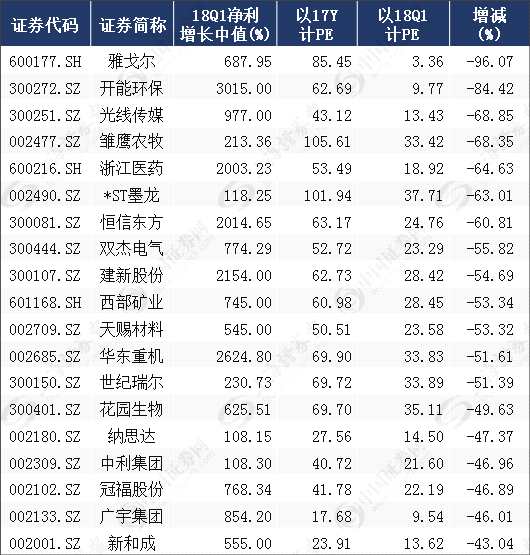 再把最新市盈率與以2017年全年凈利計(jì)算的靜態(tài)市盈率進(jìn)行比較,結(jié)果顯示,剔除市盈率為負(fù)公司后的1057只可比個(gè)股中,705只個(gè)股最新市盈率較靜態(tài)市盈率有不同程度地下滑,占比為66.70%。