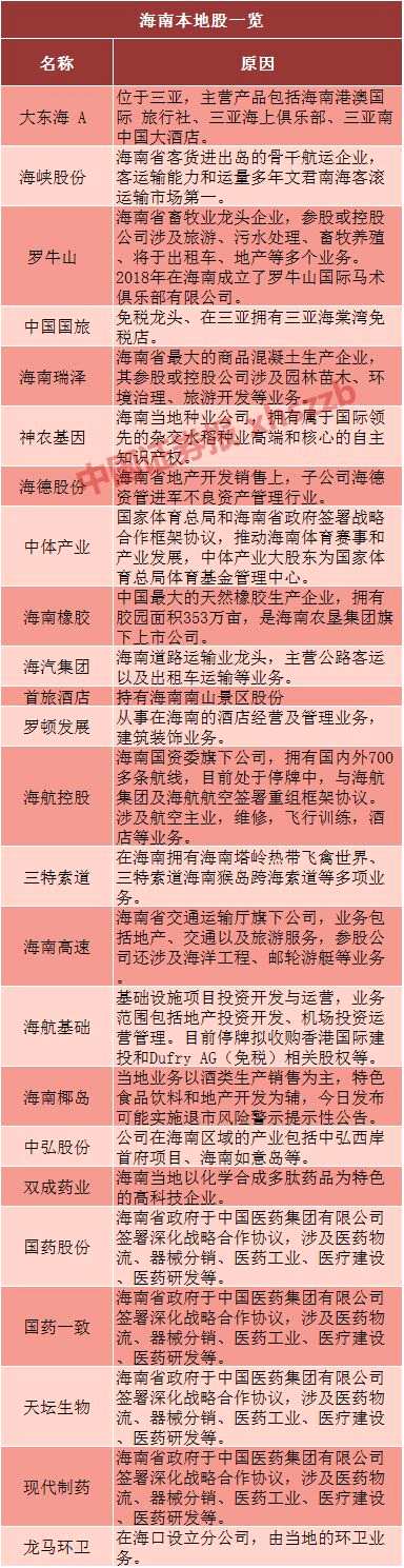 1)海南本地上市或在海南有重點(diǎn)產(chǎn)業(yè)布局的公司,尤其是旅游、醫(yī)療、農(nóng)業(yè)、科技、環(huán)保、交運(yùn)、基建、地產(chǎn)等相關(guān)領(lǐng)域;