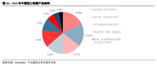 從國內的產業(yè)政策看,產業(yè)的創(chuàng)新升級給進口替代帶來了重要機遇。美國出口至中國的貿易量逐年增加。2016年為1158億美元,2017年則增長至1303億美元。從行業(yè)分布看,中國從美國進口的行業(yè)主要集中航空航天、汽車、機械、電機、電器設備及其零件,生物制藥以及醫(yī)療精密儀器制造、銅鋁制品等。