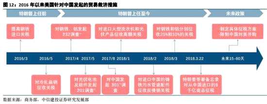 2018年以來特朗普已推出多項貿易保護措施,1月針對大型洗衣機和光伏產品分別采取為期4年和3年的全球保障措施,并分別征收最高稅率為30%和50%的關稅;2月,特朗普政府宣布對進口中國的鑄鐵污水管道配件征收109.95%的反傾銷關稅;3月,針對鋼鐵和鋁貿易救濟調查結束,宣布對鋼鐵和鋁征收25%和10%的高額關稅。