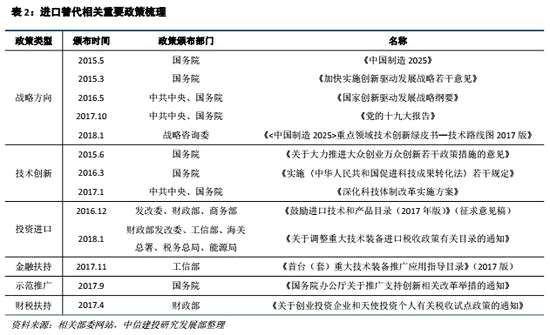 近年來,我國陸續(xù)出臺了有利于進口替代的各項宏觀政策。盡管未出臺進口替代的核心文件,但是在《中國制造2025》等未來核心產業(yè)規(guī)劃及文件中均提及了進口替代的戰(zhàn)略性意義。國家政策主要從六個方向著力:戰(zhàn)略規(guī)劃類、技術創(chuàng)新類、投資進口類、金融扶持類、示范推廣類、財稅扶持類。