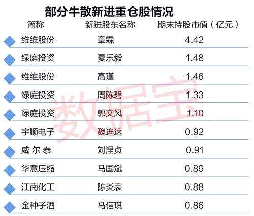 維維股份(600300) 和綠庭投資(600695)是新進(jìn)牛散期末持股市值超過億元的股票。其中,章霖新進(jìn)維維股份10114萬(wàn)股,期末持股市值4.42億元居首。另外高瑾新進(jìn)維維股份期末持股市值也超過億元;夏樂毅新進(jìn)綠庭投資1339萬(wàn)股,期末持股市值1.48億元位居次席。另外周陳碧、郭文風(fēng)兩位自然人股東新進(jìn)綠庭投資期末持股市值也超過億元。值得一提的是,有些自然人股東新進(jìn)是由于限售股解禁造成的,比如魏連速新進(jìn)宇順電子(002289) 。