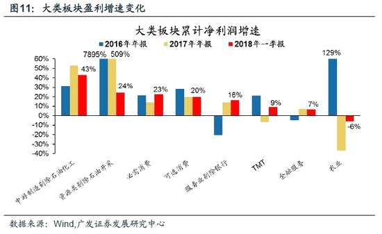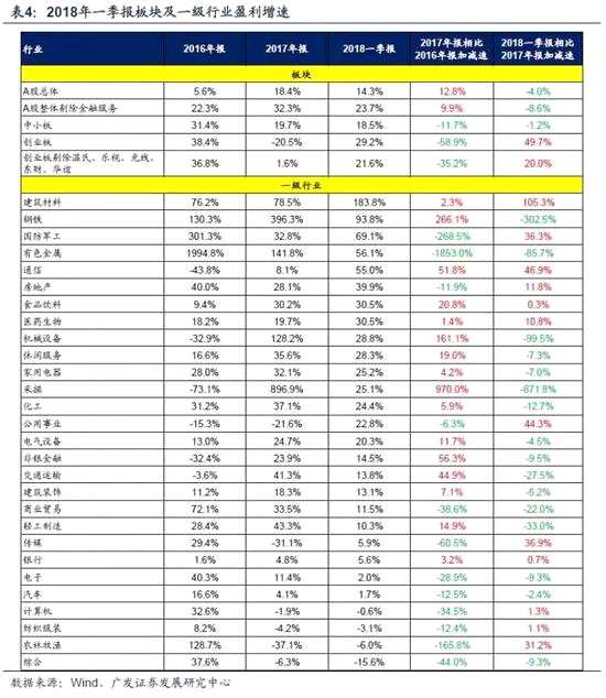 剔除權(quán)重個股的影響,創(chuàng)業(yè)板一季報盈利依然有明顯向上拐點——創(chuàng)業(yè)板剔除溫氏、樂視、光線、東財、華誼2017年三季報收入增速為41.1%,而17年年報收入增速下行至34.4%,18年一季報加速回落至24.6%。創(chuàng)業(yè)板剔除溫氏、樂視、光線、東財、華誼2017年三季報盈利增速為24.2%,而17年年報盈利增速下行至1.6%,18年一季報回升至21.5%。