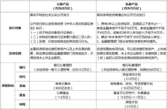 這里,公募及私募指的不是指公募私募基金,而是對包括銀行、券商、基金、保險、信托在內(nèi)的金融機構(gòu)所有資管產(chǎn)品的分類。兩者區(qū)別在于: