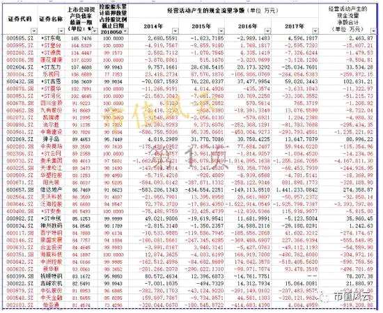 另外,連續(xù)多年出現(xiàn)經(jīng)營活動產(chǎn)生的現(xiàn)金流量凈額為負數(shù)也應該引起我們重視,在所統(tǒng)計的150余家上市公司中,2014-2017年經(jīng)營活動產(chǎn)生現(xiàn)金凈額為負的高達80家,占比超過一半。