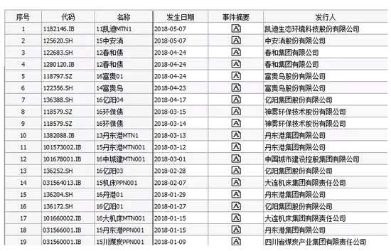 違約的不僅僅是凱迪生態(tài)。Wind統(tǒng)計數(shù)據(jù)顯示,今年以來共計19只信用債違約,除凱迪生態(tài)外,還涉及中安消(600654)、春和集團(tuán)、富貴鳥、億陽集團(tuán)、神霧環(huán)保(300156)、丹東港、大連機(jī)床以及四川省煤炭產(chǎn)業(yè)集團(tuán)有限責(zé)任公司等多家企業(yè)。其中,中安消(現(xiàn)名*ST中安(600654))、神霧環(huán)保為A股上市公司,富貴鳥則在港股上市。