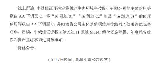 (5月9日晚間,凱迪生態(tài)公告內(nèi)容) 值得注意的是, 5月7日,中誠信就曾將凱迪生態(tài)主體信用評級從AA下調(diào)到C。