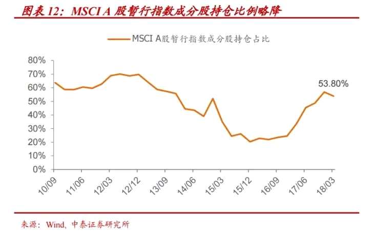 中泰證券在最近研報中指出,根據(jù)目前A股暫行指數(shù),有232只成分股是第一批潛在納入標的。這232只潛在納入標的在18Q1的基金重倉股市值約為2441億元(其中,有63只重倉股持股市值為0),占全部重倉股持股市值的比例為53.8%,與17Q4相比,持倉占比下降了3個百分點。