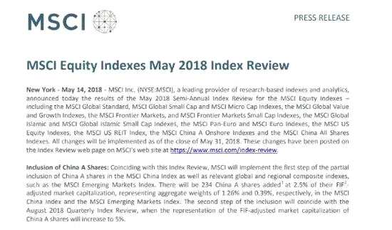 摘要: A股迎來(lái)歷史性一刻!北京時(shí)間5月15日凌晨5時(shí)左右,MSCI公布了半年度指數(shù)成分股調(diào)整結(jié)果,234只A股被納入MSCI指數(shù)體系,納入因子為2.5%,中金此前預(yù)計(jì),可能約有229只A股被納入。MSCI稱