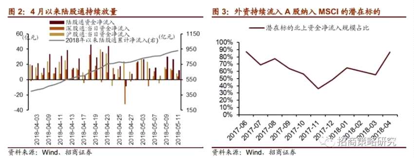 此外,2017年6月至12月,北上資金凈流入潛在標(biāo)的占總流入規(guī)模的比例平均為62.7%,2018年(除2月凈流出外)平均為69.01%,尤其4月該比例高達(dá)86.76%,5月截至目前占比為85%,足以表明近期陸股通資金向A股納入MSCI的潛在標(biāo)的集中,境外主動(dòng)資金積極布局。
