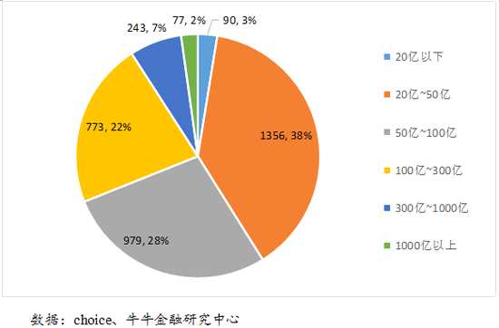當(dāng)前,A股的3518家公司的總市值為62.34萬億元,其中市值在20億至50億的公司最多,有1356家(2018年年初為1268家,2017年年初為515家),占比高達(dá)38%;