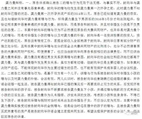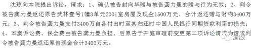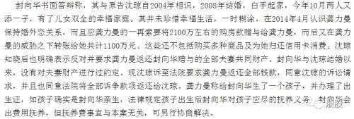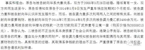 2016年3月,在龔力曼為封向華生下一個孩子后,沈瓊向杭州市濱江區(qū)法院提起訴訟,將小三和丈夫告上法庭,要求歸還贈與資金3400萬元并支付利息。