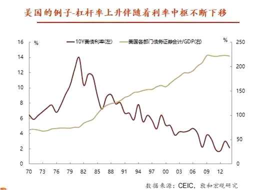 美國的例子表明,杠桿率的上升通常是伴隨著利率中樞的下行,為什么會(huì)有這樣的判斷?借錢是要還的,除非借錢不想還,一邊支付更多的利息,一邊堅(jiān)持借債要還,一定是利率下行的時(shí)候才能借更多的債。全球的杠桿加上來,背后最主要的驅(qū)動(dòng)力是三十年利率往下走的過程,美國的例子可以看得到,越到杠桿率高點(diǎn)的時(shí)候,利率中樞反而是不斷的下移。