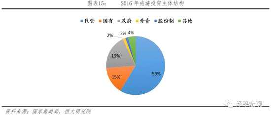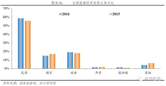 中國旅游業(yè)作為對外開放最早的領(lǐng)域之一,對外開放程度較高,不限制外商股權(quán)投資比例,市場競爭充分,形成了以民營資本為主、政府投資和國有企業(yè)投資為輔的多元主體投資格局。根據(jù)國家旅游局發(fā)布的數(shù)據(jù)顯示,2016年民營企業(yè)投資旅游業(yè)7628億元,占全部旅游投資的58.7%,投資熱點從房地產(chǎn)業(yè)向旅游綜合體及文化旅游轉(zhuǎn)變。政府投資和國有企業(yè)投資分別為2484億元和1945億元,分別占全部旅游投資的比例為19.1%和15%。