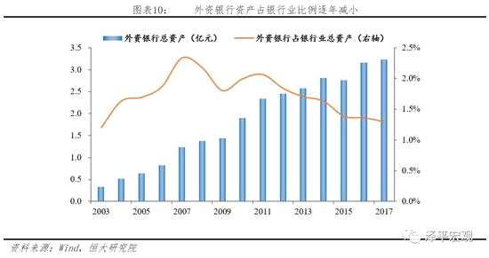 以銀行業(yè)為例,中國規(guī)定單個境外金融機構(gòu)及被其控制或共同控制的關(guān)聯(lián)方作為發(fā)起人或戰(zhàn)略投資者向單個中資商業(yè)銀行投資入股比例不得超過20%,多個境外金融機構(gòu)及被其控制或共同控制的關(guān)聯(lián)方作為發(fā)起人或戰(zhàn)略投資者投資入股比例合計不得超過25%。當(dāng)前中國銀行(601988,股吧)業(yè)仍以國企為主,外資、民營銀行比例占比較低,其中外資銀行自上世紀(jì)90年代以來,資產(chǎn)占比一直在2%左右徘徊,2017年已降至1.3%,遠(yuǎn)低于OECD國家平均高于10%的水平。