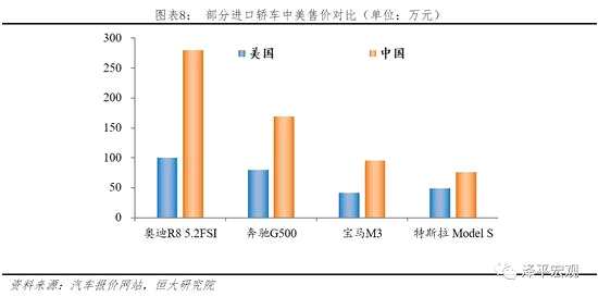 作為中國經(jīng)濟(jì)發(fā)展的支柱產(chǎn)業(yè)之一,汽車承載著中國制造業(yè)升級的戰(zhàn)略任務(wù)和市場化要求。但是,汽車行業(yè)仍受行政干預(yù)較大,具體體現(xiàn)為對于外資投資準(zhǔn)入、產(chǎn)品目錄、進(jìn)出口、消費政策等各個環(huán)節(jié)進(jìn)行的高度行政管制。以關(guān)稅為例,改革之前,中國汽車行業(yè)存在稅種多,稅率高,行政費用高等問題,購買進(jìn)口車輛需平均繳納關(guān)稅25%,增值稅17%,根據(jù)車輛排量分級繳納1%-40%不等的消費稅,另外部分車型還需繳納2%-13%的“雙反稅”(反傾銷、反補貼)。此外,中國規(guī)定外資對汽車整車、專用汽車制造控股不得超過50%,對外商進(jìn)入汽車行業(yè)施加準(zhǔn)入限制,進(jìn)一步推高。較高關(guān)稅疊加中間環(huán)節(jié)壟斷導(dǎo)致國內(nèi)進(jìn)口車輛,尤其是豪華型轎車價格大幅高于海外售價,消費者權(quán)益受到損害。以奧迪A8為例,該車在美國售價約50-63萬,中國售價88-257,價格上漲76%-308%。