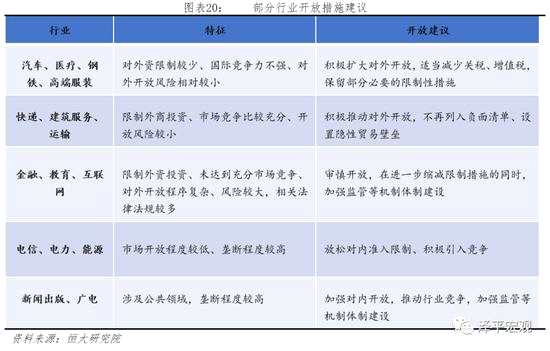 以開放促改革,但開放也不能一蹴而就,根據(jù)開放難度、風(fēng)險等不同情況,應(yīng)有序?qū)?nèi)對外開放。根據(jù)國際經(jīng)驗,中國可考慮采用對內(nèi)開放優(yōu)先對外開放、優(yōu)先放開市場化行業(yè)、對關(guān)鍵敏感行業(yè)開放要慎重的開放戰(zhàn)略。當(dāng)前中國在汽車、金融、高端服裝、能源、建筑設(shè)計、醫(yī)療、教育、電信、互聯(lián)網(wǎng)、新聞出版、廣電、快遞等領(lǐng)域還存在很大的對內(nèi)對外開放空間。在對外開放過程中,優(yōu)先放開能夠市場化、風(fēng)險較小的行業(yè),促進(jìn)市場競爭,引入先進(jìn)技術(shù),提升民生福利,比如,電信、電力、能源、汽車、醫(yī)療、鋼鐵、高端服裝等能夠市場化的行業(yè)。對建筑服務(wù)、運輸行業(yè)等不再列入負(fù)面清單,速遞行業(yè)等不再設(shè)置隱性貿(mào)易壁壘。對風(fēng)險較大的領(lǐng)域,如金融、教育、互聯(lián)網(wǎng)等行業(yè),穩(wěn)步有序開放,在進(jìn)一步縮減限制措施的同時,加強監(jiān)管機制建設(shè)。對涉及公共服務(wù)、文化傳播等領(lǐng)域的關(guān)鍵行業(yè),中國應(yīng)審慎進(jìn)行開放,同時加強監(jiān)管機制建設(shè),如新聞出版、廣電等領(lǐng)域。