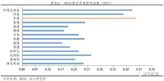 中國服務(wù)業(yè)開放程度仍相對較低。受境內(nèi)外市場規(guī)則制度差異、配套法律法規(guī)及相關(guān)設(shè)施建設(shè)不到位等影響,當(dāng)前我國服務(wù)業(yè)對外開放程度仍處于較低水平。根據(jù)經(jīng)濟(jì)合作發(fā)展組織(OECD)發(fā)布的服務(wù)貿(mào)易限制指數(shù),當(dāng)前OECD國家普遍在建筑業(yè)、工程、廣播、電信、商業(yè)銀行、保險以及計算機開放程度較高,而中國快遞、商業(yè)銀行、保險業(yè)、電信、廣播、電影行業(yè)均顯著高于OECD成員國平均水平,當(dāng)前中國服務(wù)業(yè)對外開放程度仍受對外資準(zhǔn)入限制、競爭障礙、監(jiān)管透明性及其他因素的影響而低于國際水平。