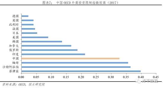 外商投資在中國部分領(lǐng)域受限程度仍然較高。當(dāng)前中國在部分產(chǎn)業(yè)如汽車、金融、醫(yī)療、電信仍設(shè)置相對較緊外資持股比例限制,對教育、互聯(lián)網(wǎng)、新聞出版、廣電等領(lǐng)域仍處于限制外商投資狀態(tài)。2017年,中國在經(jīng)濟(jì)合作發(fā)展組織(OECD)公布的對外資總限制程度中排名第四,僅低于菲律賓、沙特和緬甸。其中,在金融服務(wù)業(yè)的開放上,中國的限制程度排為第二,僅僅低于緬甸。當(dāng)前中國部分行業(yè)仍存在很大的對內(nèi)對外開放空間,降低關(guān)稅、放開股權(quán)比例限制、取消進(jìn)口配額限制、打破壟斷、放開行業(yè)管制的對外開放還任重道遠(yuǎn)。